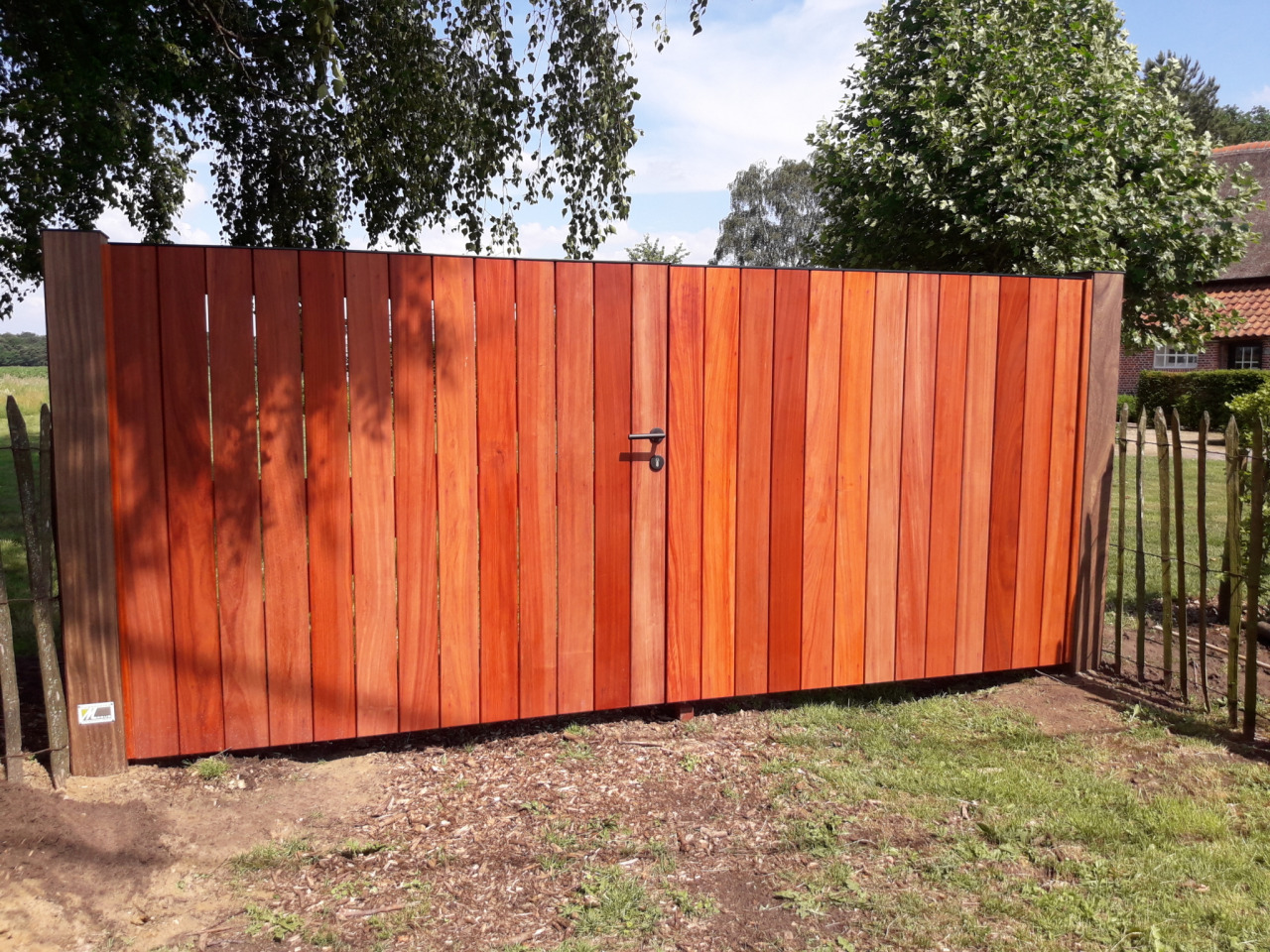 Strakke padouk poort met alum.afdekkap afgewerkt - Kasterlee